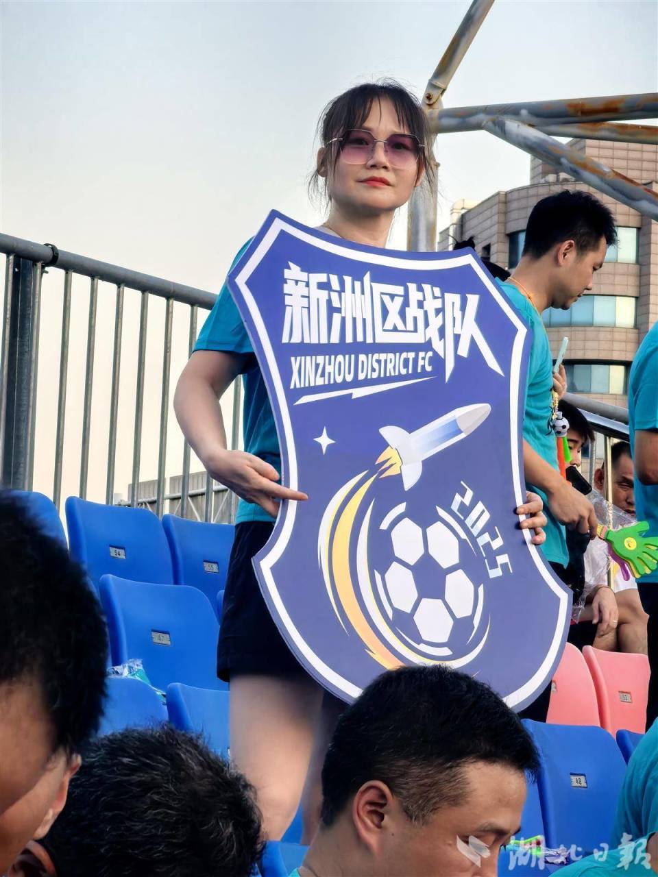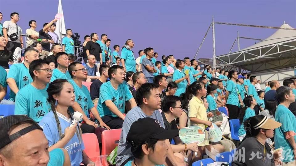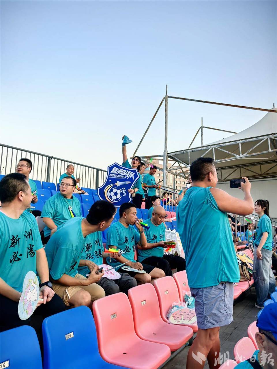 观众席上,来自新洲区的热心球迷换上了和足球队同样颜色的统一服装,还有球迷带来了大鼓,为加油声增加阵阵鼓点。不少球迷高举展牌和旗帜,尽展球迷风采 。